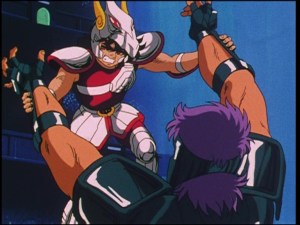 Al principio, Seiya lleva ventaja, pero el Caballero de la Osa Mayor, Geki, consigue cogerlo por el cuello con ambas manos y, cómo tiene mucha fuerza en los brazos, parece que va a ser Geki quien gane.